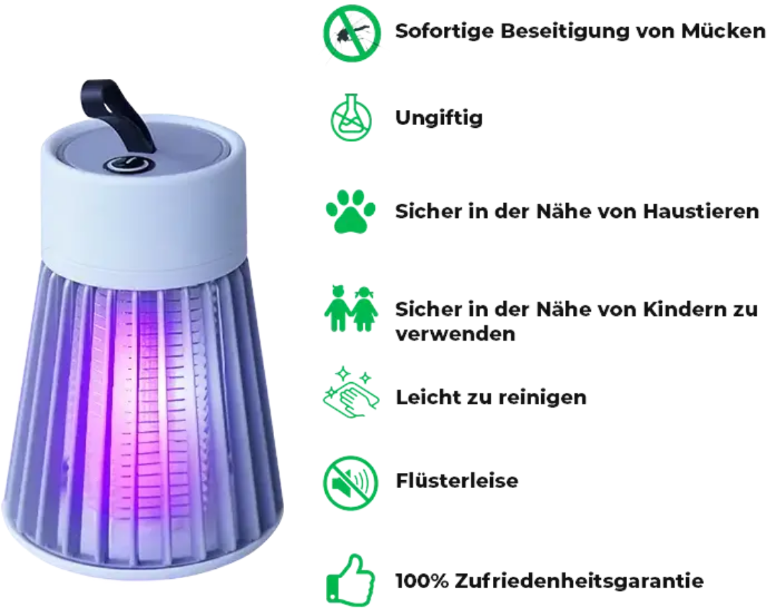 Mit einer speziellen UV-Lichtfrequenz lockt das Gerät Mücken an und tötet sie sofort – ganz ohne Chemikalien.